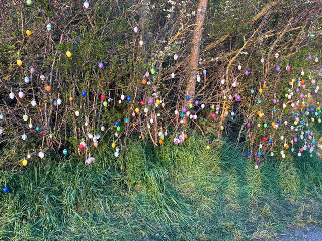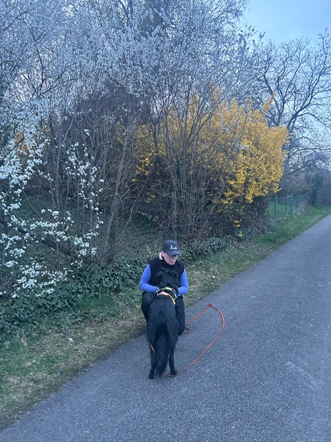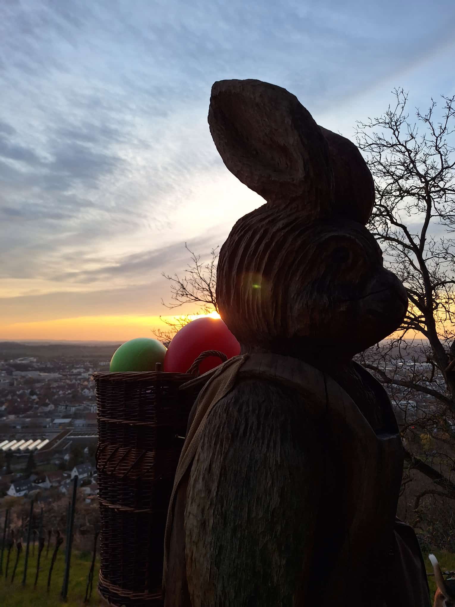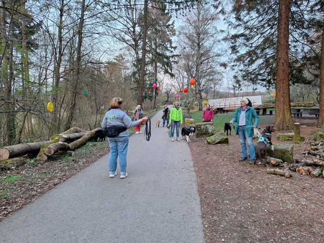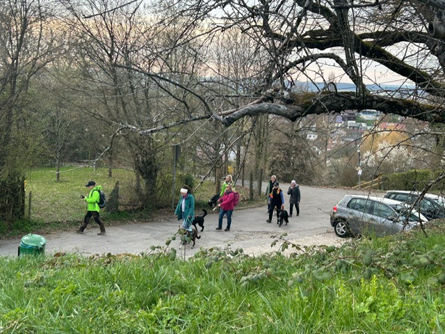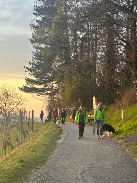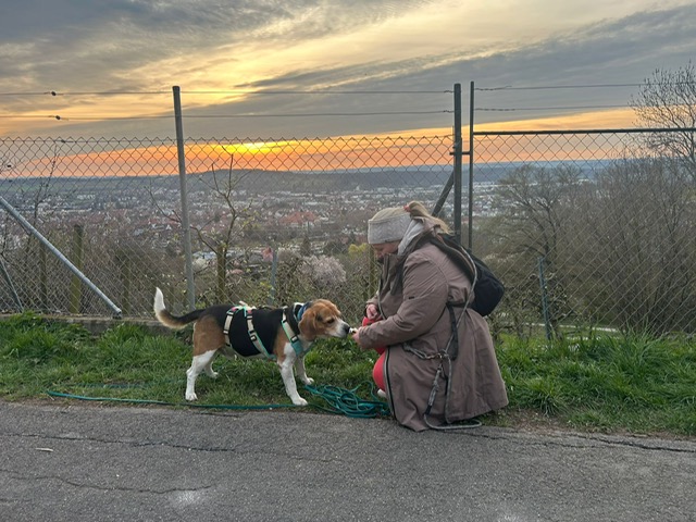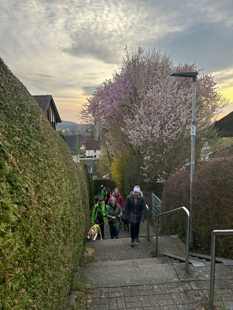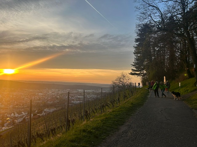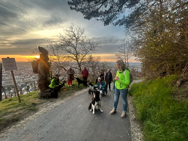 Ab diesem Zeitpunkt mussten sie einer 24 Stunden alten Spur folgen, die zufälligerweise auch durch den wunderschönen Metzinger Osterpfad führte. Um den Osterpfad zu erreichen, mussten jedoch zunächst einige Treppen und einen Anstieg von mehreren Metern überwunden werden – ein Herausforderung für Zwei- und Vierbeiner gleichermaßen. An den verschiedenen Etappenpunkten, an denen das Trailteam gewechselt wurde, gab es viel zu sehen und zu entdecken. Besonders beeindruckend war der Sonnenuntergang über Metzingen. Insgesamt legten wir fast 6 km zurück.